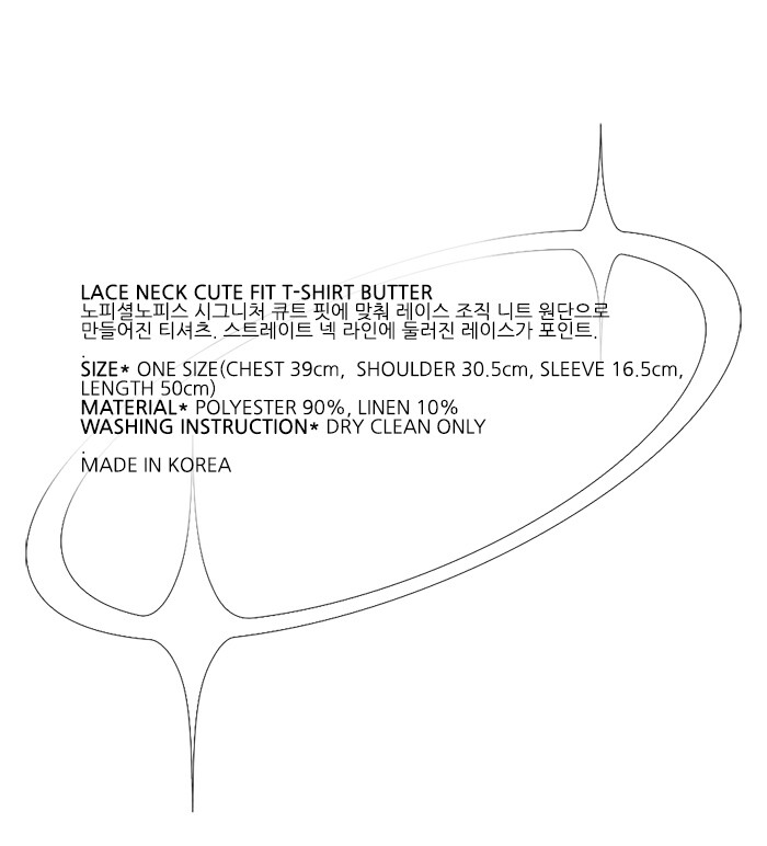 노피셜노피스 시그니처 큐트 핏에 맞춰 레이스 조직 니트 원단으로 만들어진 티셔츠. 스트레이트 넥 라인에 둘러진 레이스가 포인트.