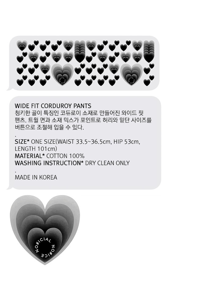 청키한 골이 특징인 코듀로이 소재로 만들어진 와이드 핏 팬츠. 트윌 면과 소재 믹스가 포인트로 허리와 밑단 사이즈를 버튼으로 조절해 입을 수 있다.