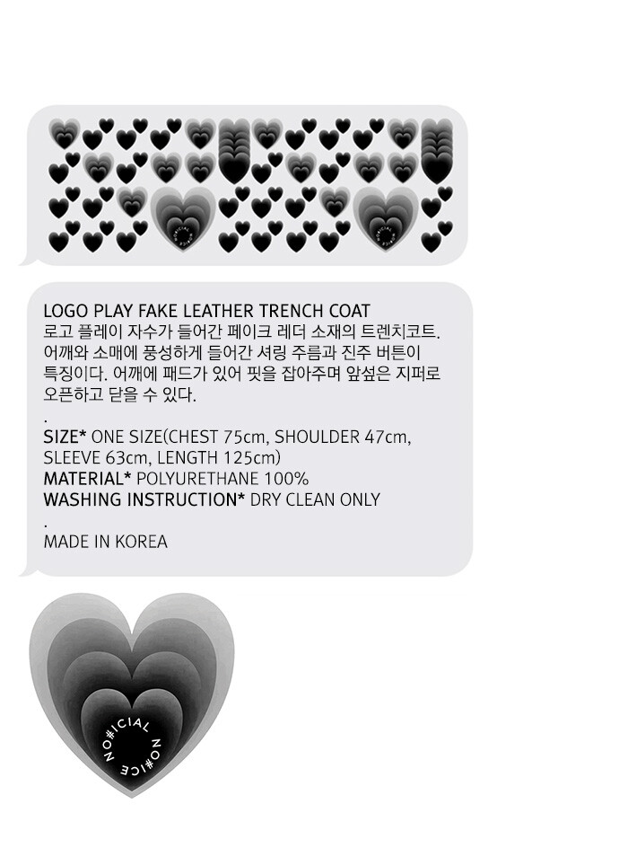 로고 플레이 자수가 들어간 페이크 레더 소재의 트렌치코트. 어깨와 소매에 풍성하게 들어간 셔링 주름과 진주 버튼이 특징이다. 어깨에 패드가 있어 핏을 잡아주며 앞섶은 지퍼로 오픈하고 닫을 수 있다.