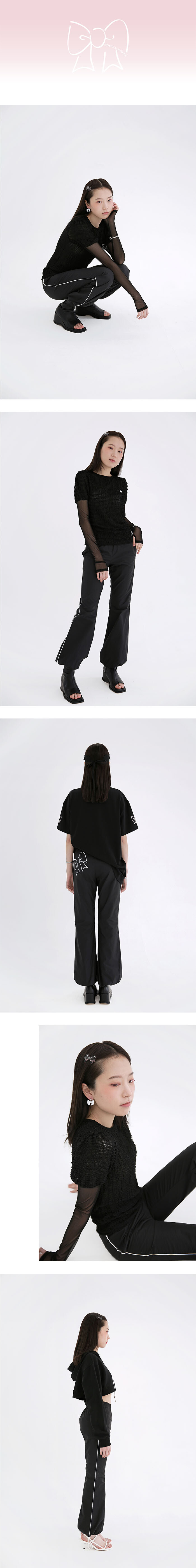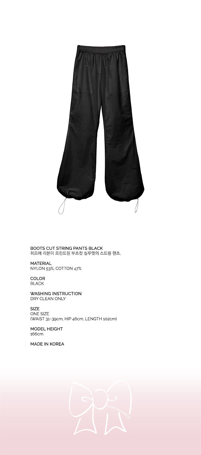 히프에 리본이 프린트된 부츠컷 실루엣의 스트링 팬츠.