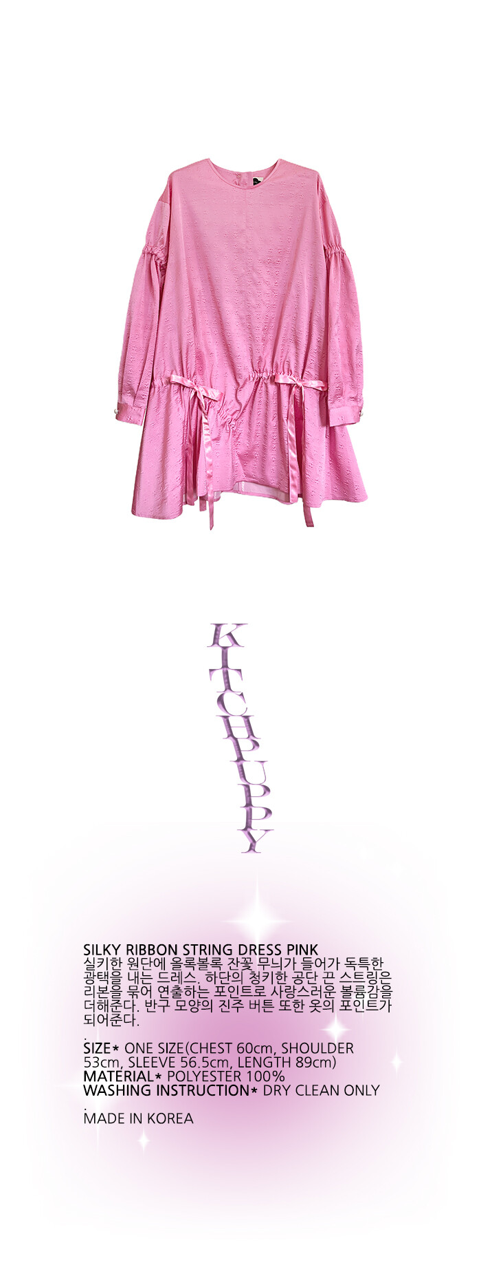 실키한 원단에 올록볼록 잔꽃 무늬가 들어가 독특한 광택을 내는 드레스. 하단의 청키한 공단 끈 스트링은 리본을 묶어 연출하는 포인트로 사랑스러운 볼륨감을 더해준다. 반구 모양의 진주 버튼 또한 옷의 포인트가 되어준다.