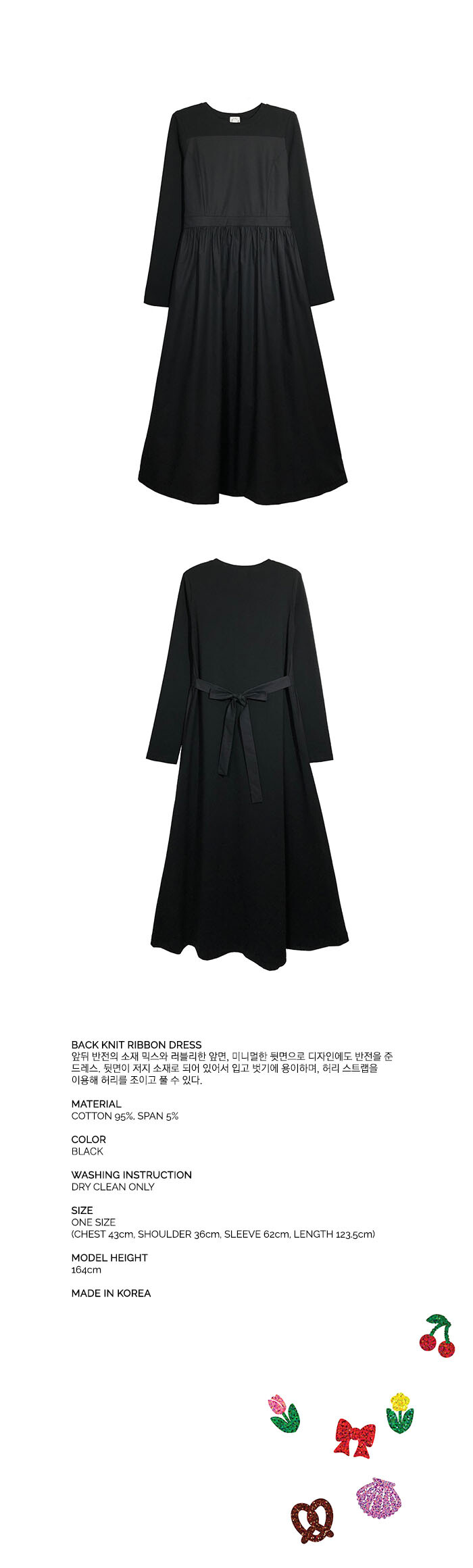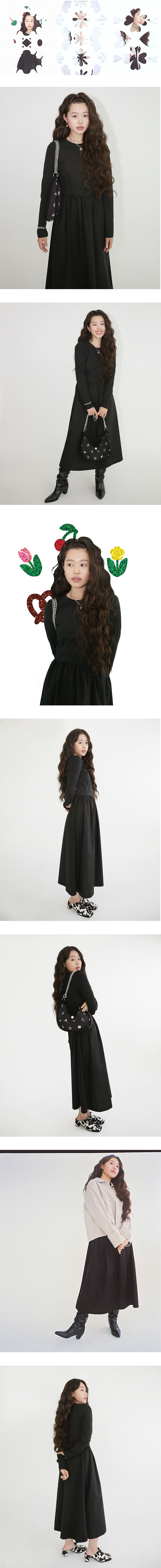 앞뒤 반전의 소재 믹스와 러블리한 앞면, 미니멀한 뒷면으로 디자인에도 반전을 준 드레스. 뒷면이 저지 소재로 되어 있어서 입고 벗기에 용이하며, 허리 스트랩을 이용해 허리를 조이고 풀 수 있다.