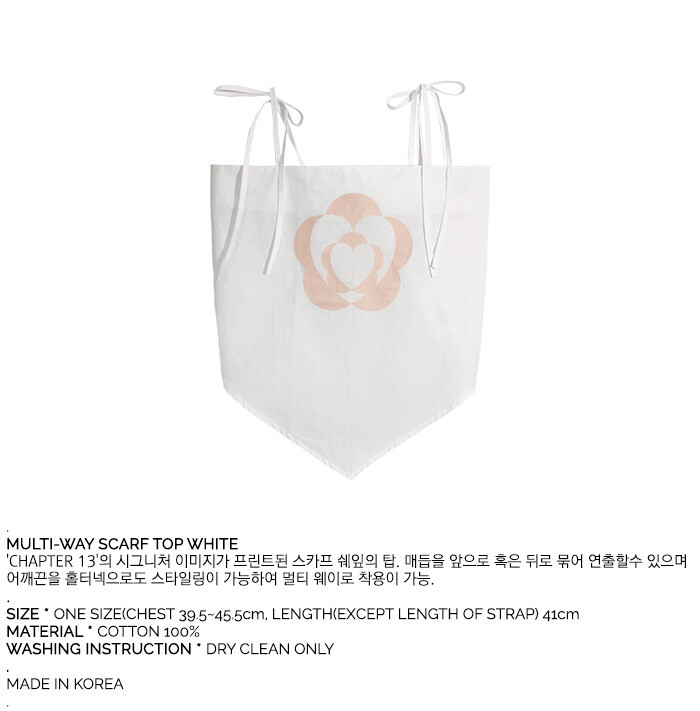 'CHAPTER 13'의 시그니처 이미지가 프린트된 스카프 쉐잎의 탑. 매듭을 앞으로 혹은 뒤로 묶어 연출할수 있으며 어깨끈을 홀터넥으로도 스타일링이 가능하여 멀티 웨이로 착용이 가능.