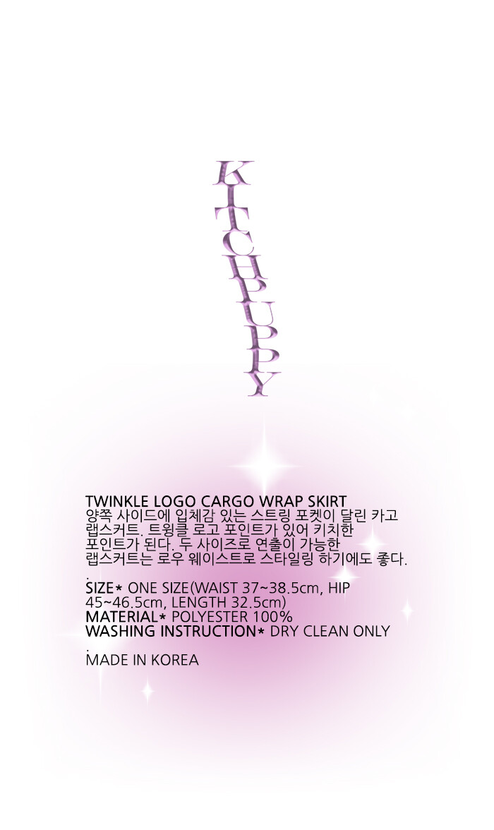 양쪽 사이드에 입체감 있는 스트링 포켓이 달린 카고 랩스커트. 트윙클 로고 포인트가 있어 키치한 포인트가 된다. 두 사이즈로 연출이 가능한 랩스커트는 로우 웨이스트로 스타일링 하기에도 좋다.