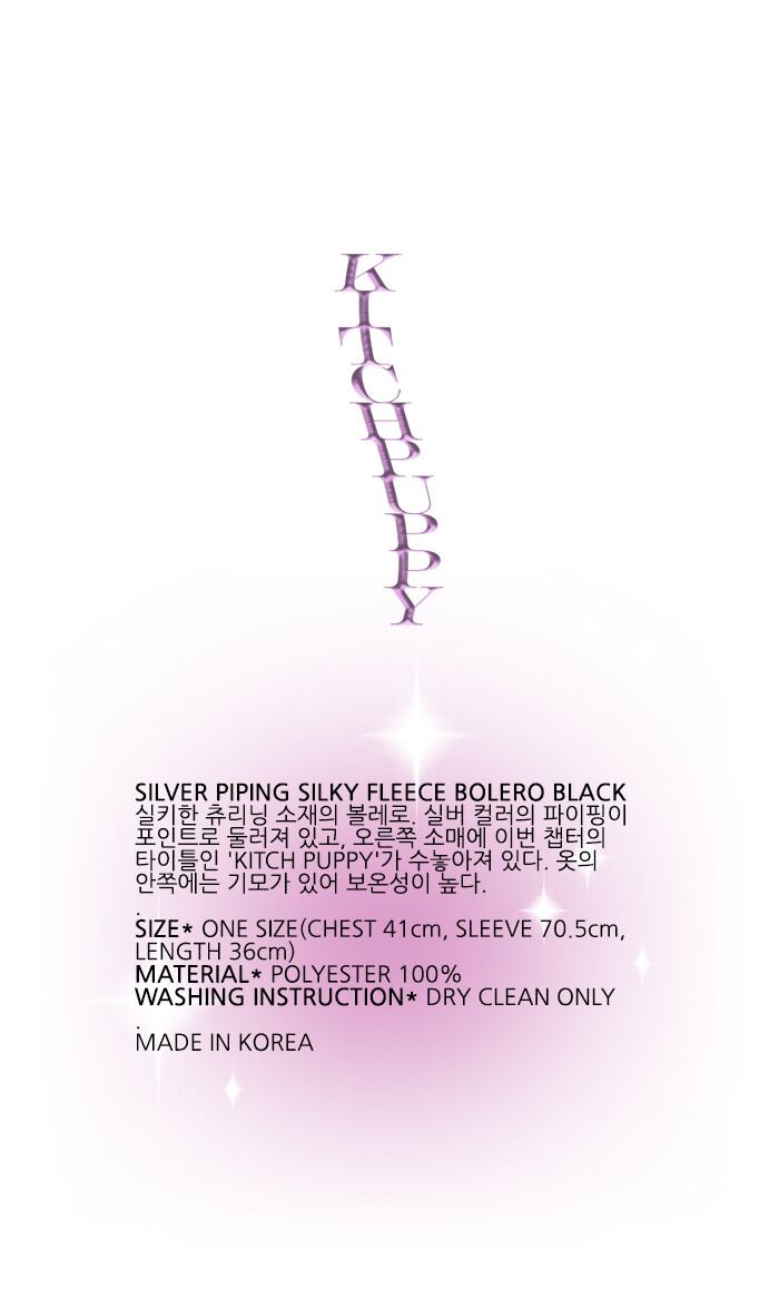 실키한 츄리닝 소재의 볼레로. 실버 컬러의 파이핑이 포인트로 둘러져 있고, 오른쪽 소매에 이번 챕터의 타이틀인 'KITCH PUPPY'가 수놓아져 있다. 옷의 안쪽에는 기모가 있어 보온성이 높다.
