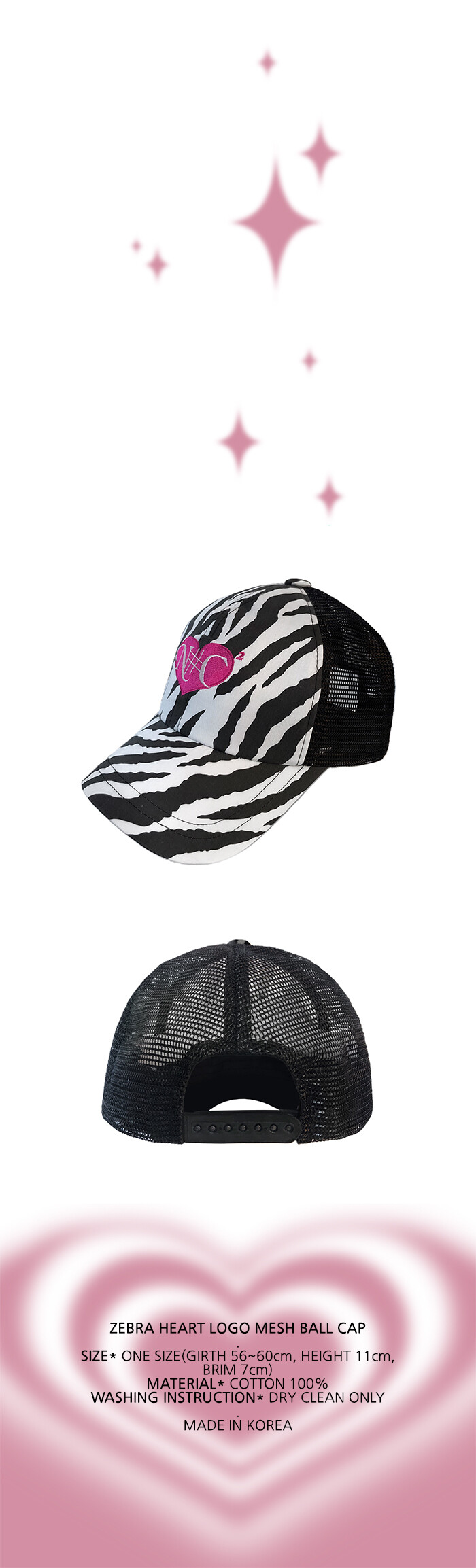 블랙 앤 화이트 지브라 패턴 바탕에 레몬 컬러의 하트 로고가 수놓아진 매쉬볼캡.