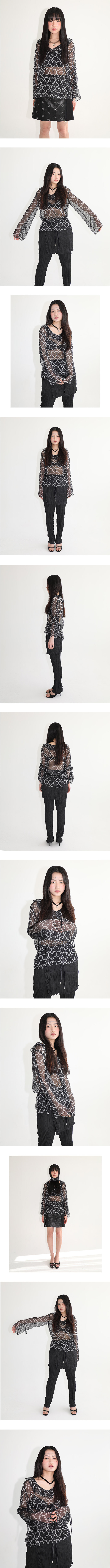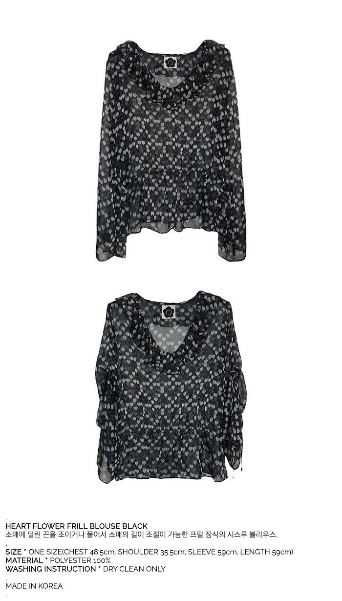 소매에 달린 끈을 조이거나 풀어서 소매의 길이 조절이 가능한 프릴 장식의 시스루 블라우스.