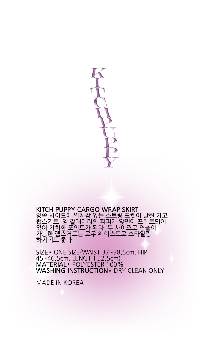 양쪽 사이드에 입체감 있는 스트링 포켓이 달린 카고 랩스커트. 양 갈래머리의 퍼피가 앞면에 프린트되어 있어 키치한 포인트가 된다. 두 사이즈로 연출이 가능한 랩스커트는 로우 웨이스트로 스타일링 하기에도 좋다.