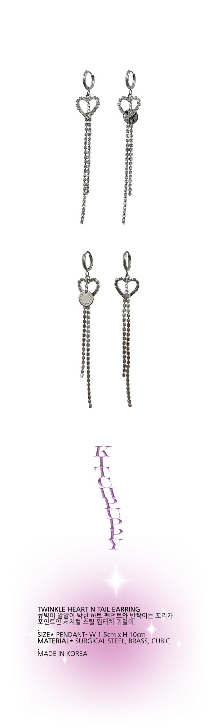 큐빅이 알알이 박힌 하트 펜던트와 반짝이는 꼬리가 포인트인 서지컬 스틸 원터치 귀걸이.