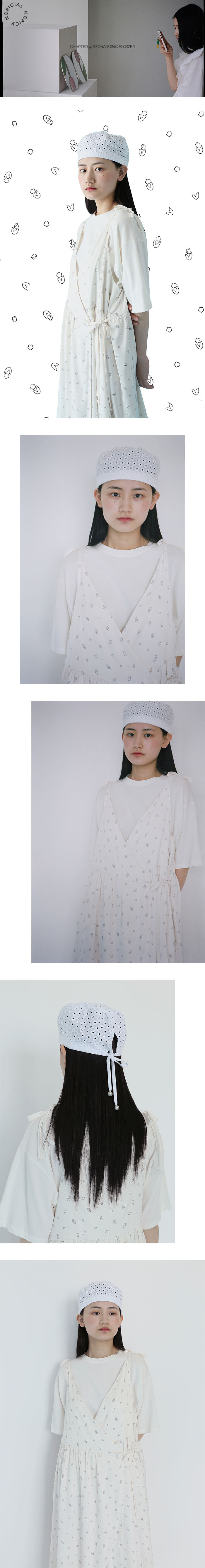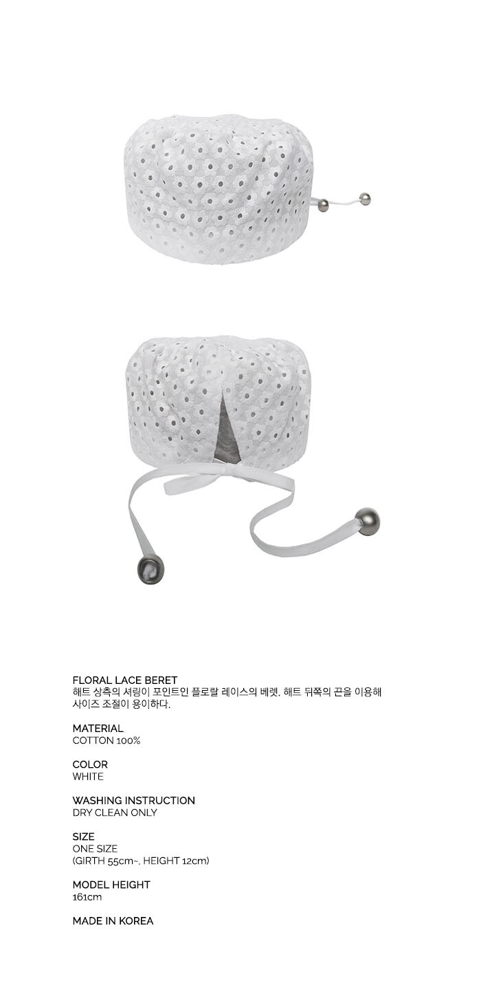 해트 상측의 셔링이 포인트인 플로랄 레이스의 베렛. 해트 뒤쪽의 끈을 이용해 사이즈 조절이 용이하다.