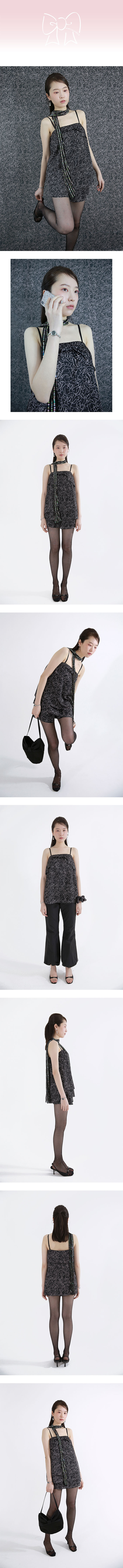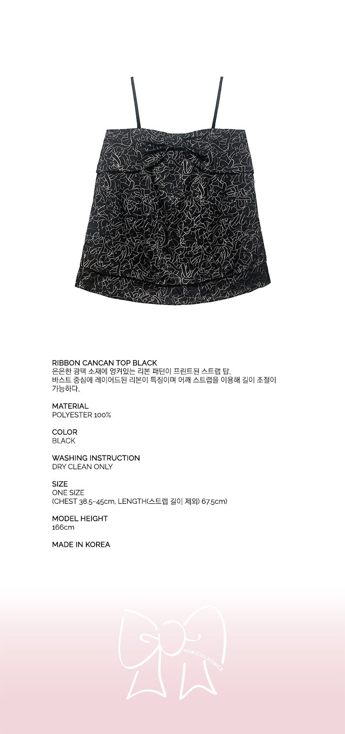 은은한 광택 소재에 엉켜있는 리본 패턴이 프린트된 스트랩 탑. 바스트 중심에 레이어드된 리본이 특징이며 어깨 스트랩을 이용해 길이 조절이 가능하다.