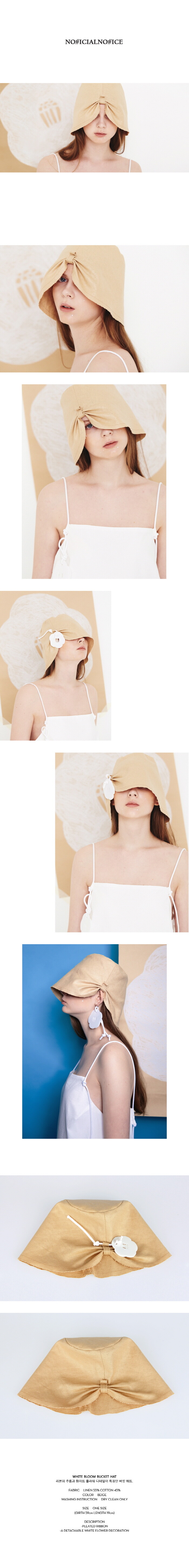 리본의 주름과 화이트 플라워 디테일이 특징인 버킷 해트.