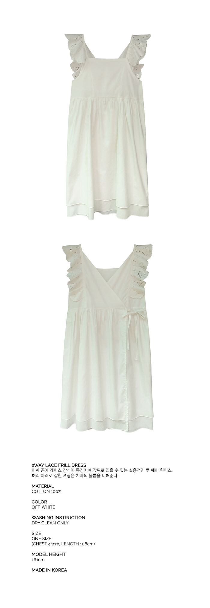 어깨 끈에 레이스 장식이 특징이며 앞뒤로 입을 수 있는 실용적인 투웨이 원피스. 허리 아래로 잡힌 셔링은 치마의 볼륨을 더해준다.