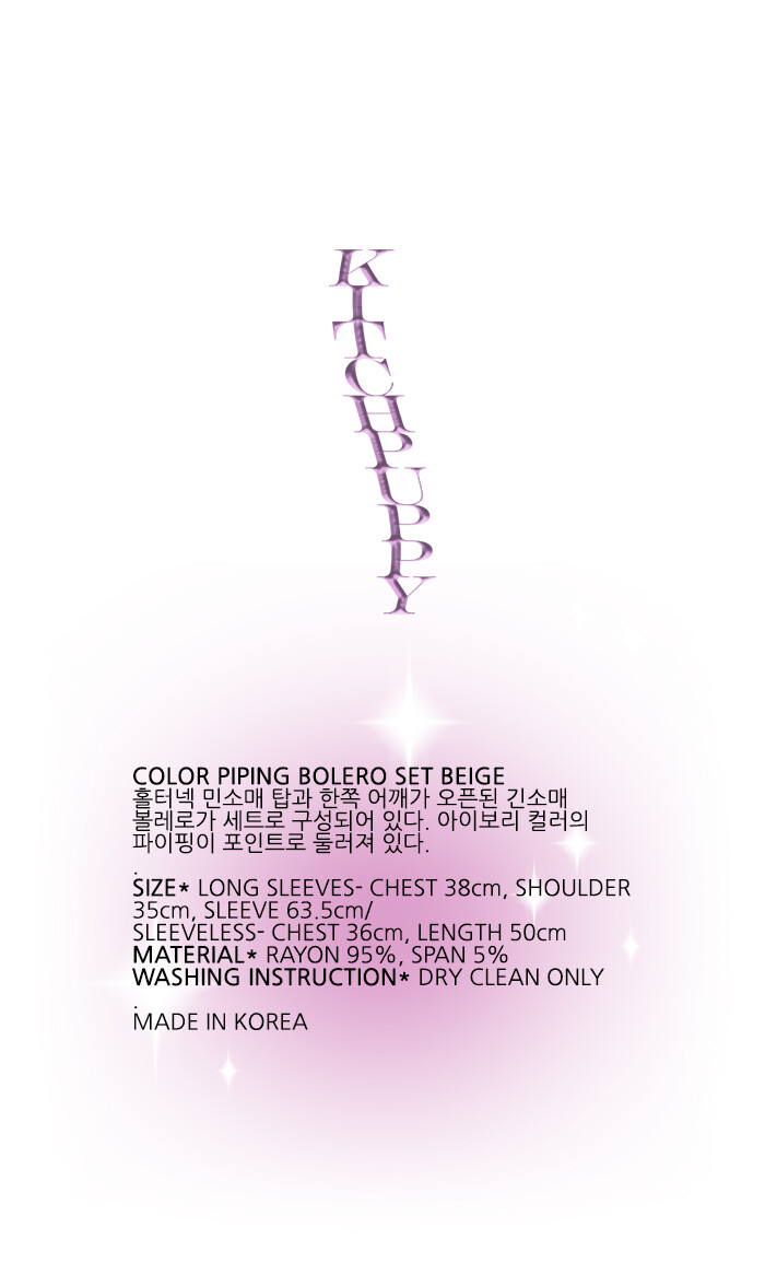 홀터넥 민소매 탑과 한쪽 어깨가 오픈된 긴소매 볼레로가 세트로 구성되어 있다. 아이보리 컬러의 파이핑이 포인트로 둘러져 있다.