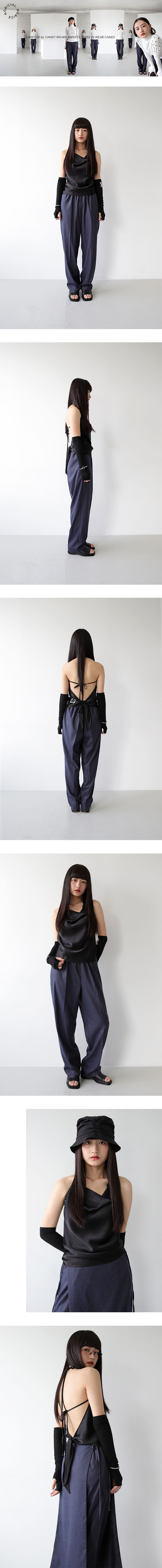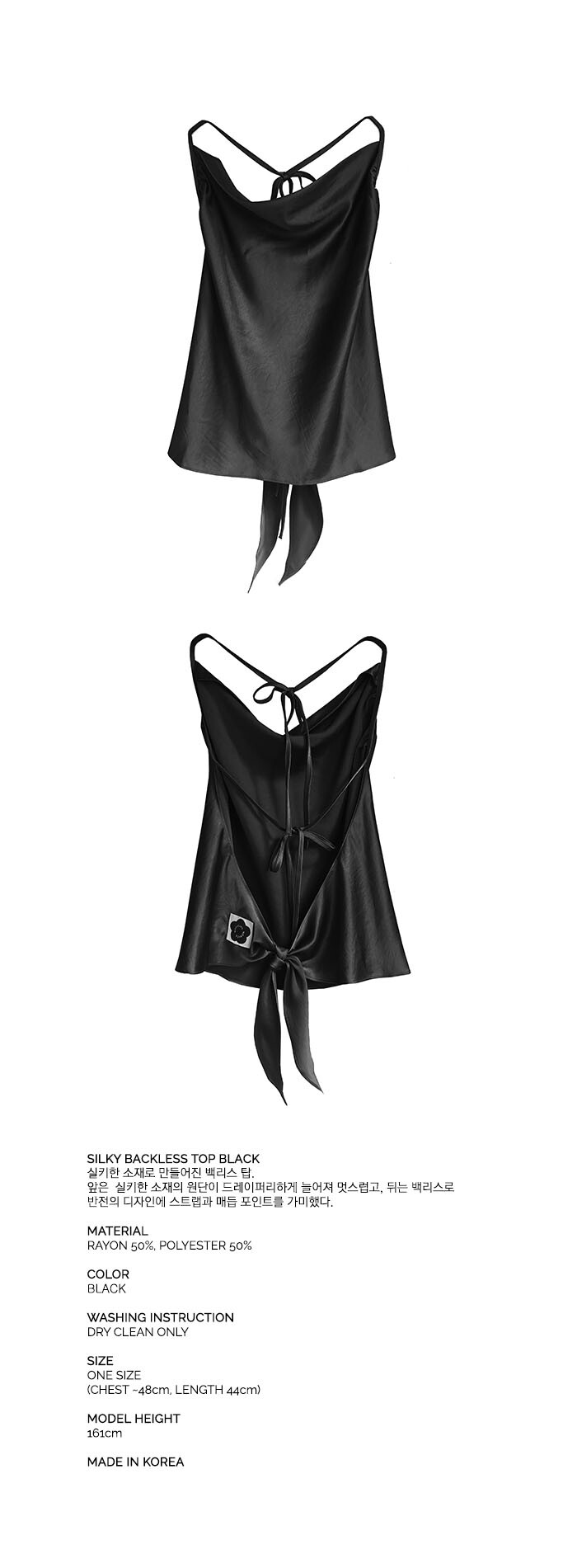 실키한 소재로 만들어진 백리스 탑. 앞은 실키한 소재의 원단이 드레이퍼리하게 늘어져 멋스럽고, 뒤는 백리스로 반전의 디자인에 스트랩과 매듭 포인트를 가미했다.