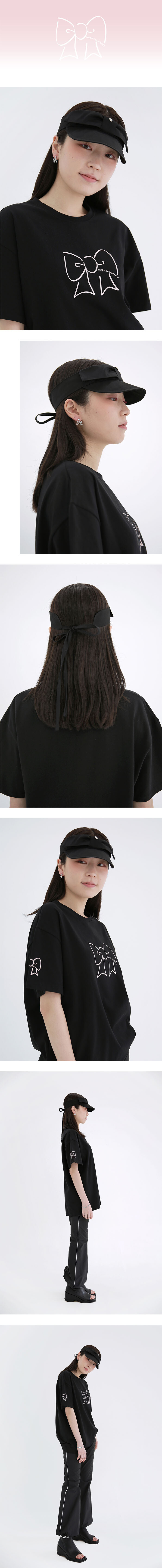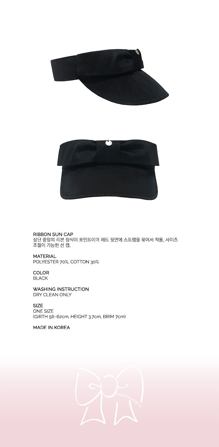 상단 중앙의 리본 장식이 포인트이며 헤드 뒷면에 스트랩을 묶어서 착용, 사이즈 조절이 가능한 선 캡.