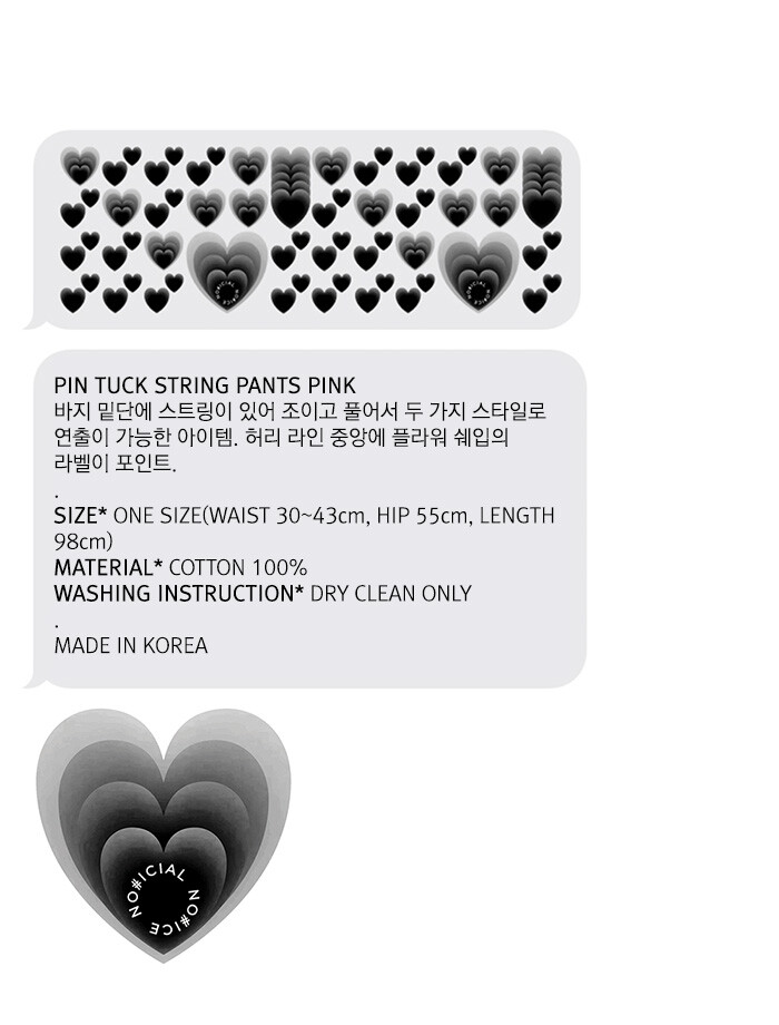 팬츠 밑단에 스트링이 있어 조이고 풀어서 두 가지 스타일로 연출이 가능한 아이템. 허리 라인 중앙에 플라워 쉐입의 라벨이 포인트.