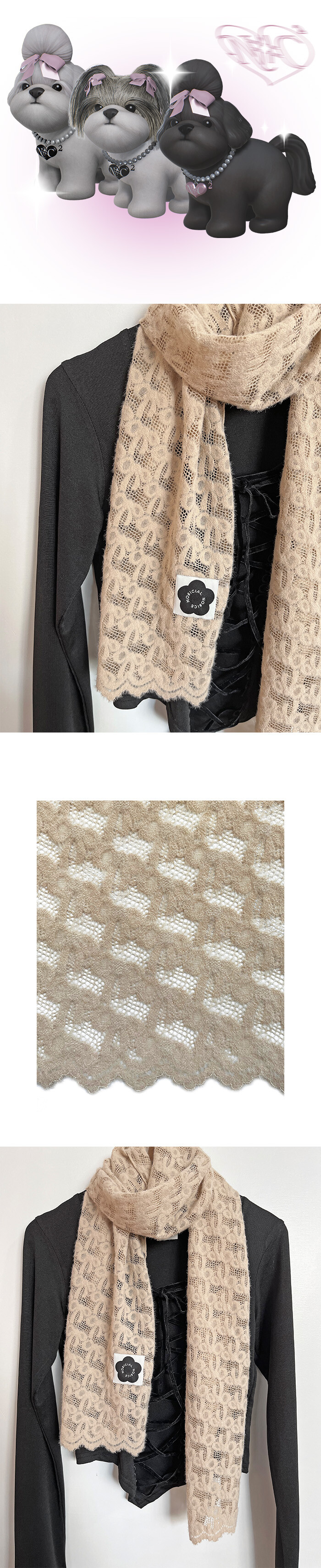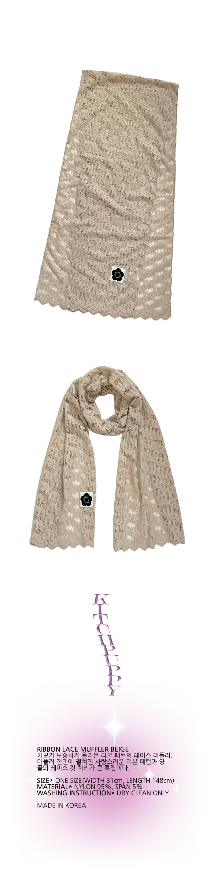기모가 보송하게 올라온 리본 패턴의 레이스 머플러. 머플러 전면에 펼쳐진 사랑스러운 리본 패턴과 양 끝의 레이스 컷 처리가 큰 특징이다.