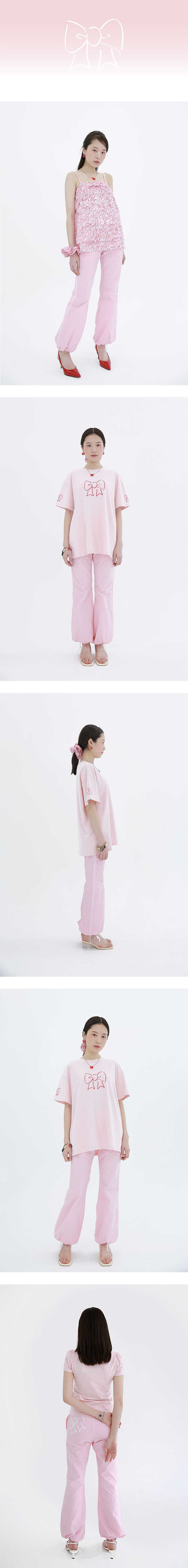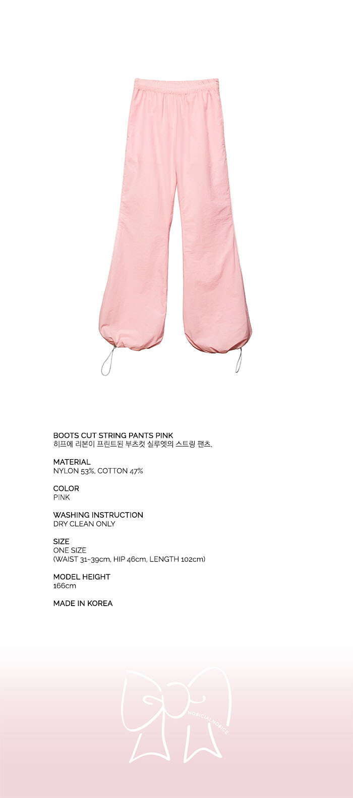 히프에 리본이 프린트된 부츠컷 실루엣의 스트링 팬츠.