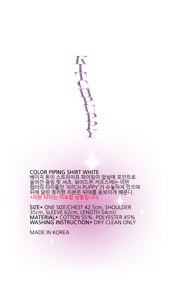 베이지 톤의 스트라이프 파이핑이 앞섶에 포인트로 들어간 슬림 핏 셔츠. 와이드한 커프스에는 이번 챕터의 타이틀인 'KITCH PUPPY'가 수놓아져 있으며 뒤에 달린 청키한 리본은 뒤태를 돋보이게 해준다.
