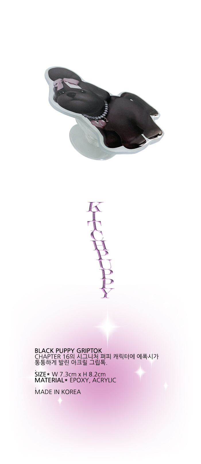 CHAPTER 16의 시그니처 퍼피 캐릭터에 에폭시가 통통하게 발린 아크릴 그립톡.