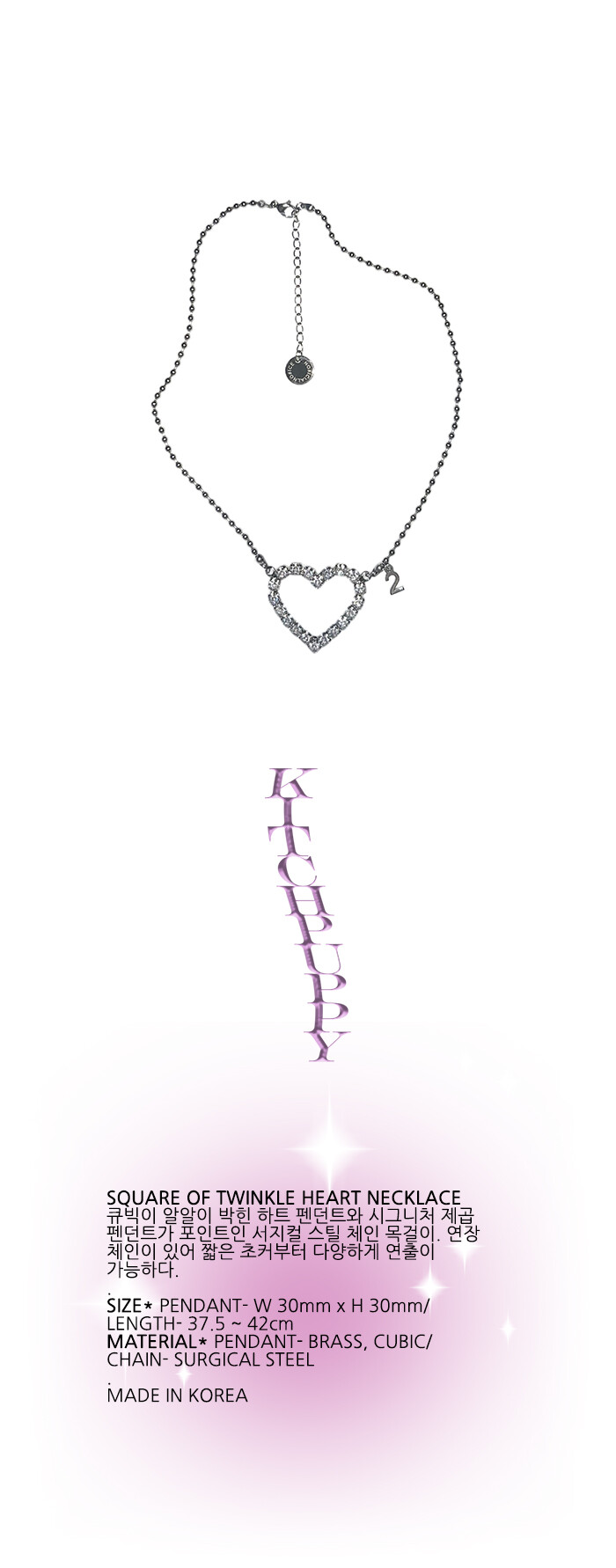 큐빅이 알알이 박힌 하트 펜던트와 시그니처 제곱 펜던트가 포인트인 서지컬 스틸 체인 목걸이. 연장 체인이 있어 짧은 초커부터 다양하게 연출이 가능하다.