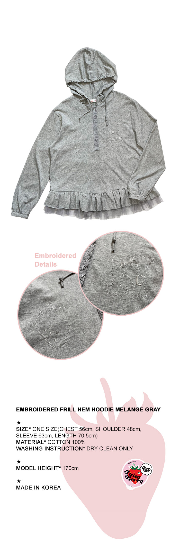 EMBROIDERED FRILL HEM HOODIE MELANGE GRAY